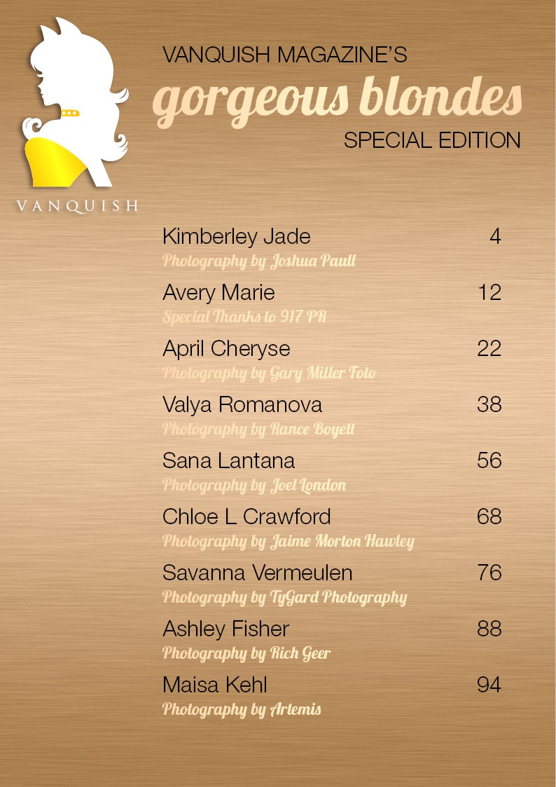 Vanquish Magazine – Gorgeous Blondes 2017 – April CherysenModels: Kimberley Jade, Avery Marie, April Cheryse, Valya Romanova, Sana Lantana, Chloe L Crawford, Savanna Vermeulen, Ashley Fisher, Maisa Kehl, nPhotographers: Joshua Paull, 917 PR, Brian B. Hayes, Gary Miller Foto, Rance Boyett, Joel London, Jaime Morton Hawley, TyGard Photography, Rich Greer, Artemis, n
